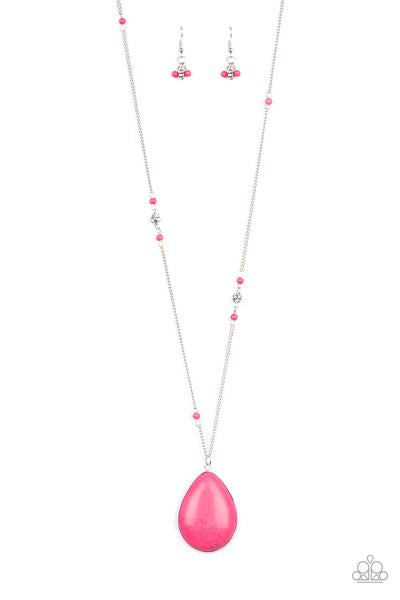 Dotted with dainty silver flowers and pink stone beads, a shimmery silver chain gives way to an oversized pink stone teardrop pendant for a whimsical look. Features an adjustable clasp closure.