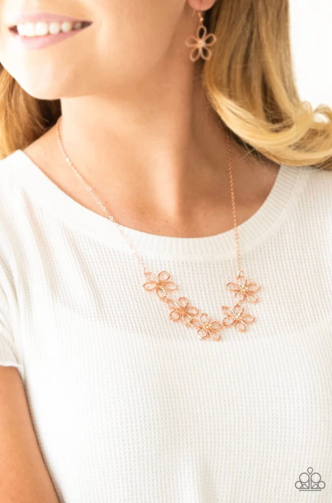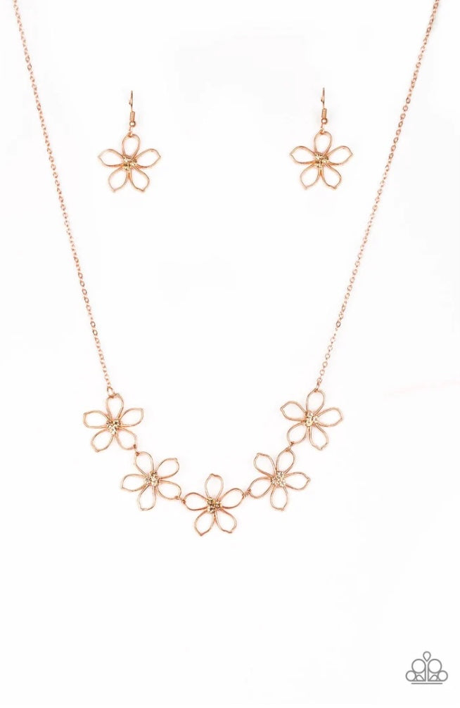 Dotted with radiant rhinestone centers, airy shiny copper flowers link below the collar for a seasonal look. Features an adjustable clasp closure.